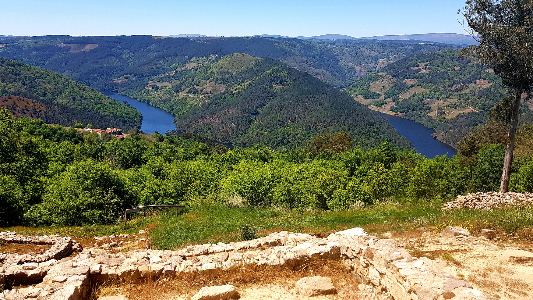 Castro celta en el Pazo de Arxeriz. Al fondo el Cabo de Mundo, espectacular meandro del río Miño. |
