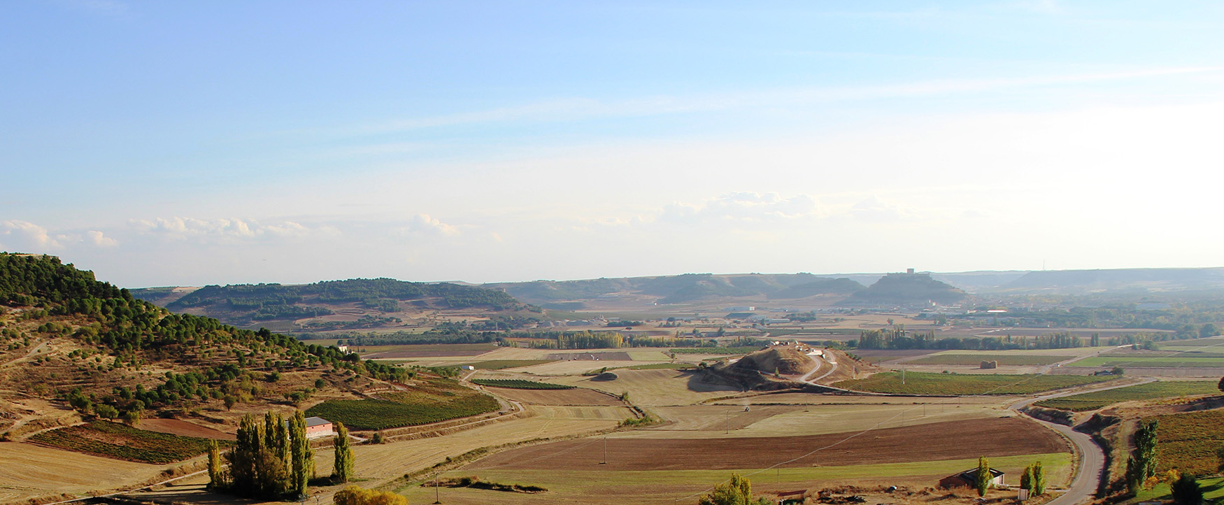 Vista de la ribera del Duero desde el castillo de Curiel. Al fondo en el horizonte el castillo de Peñafiel. |
