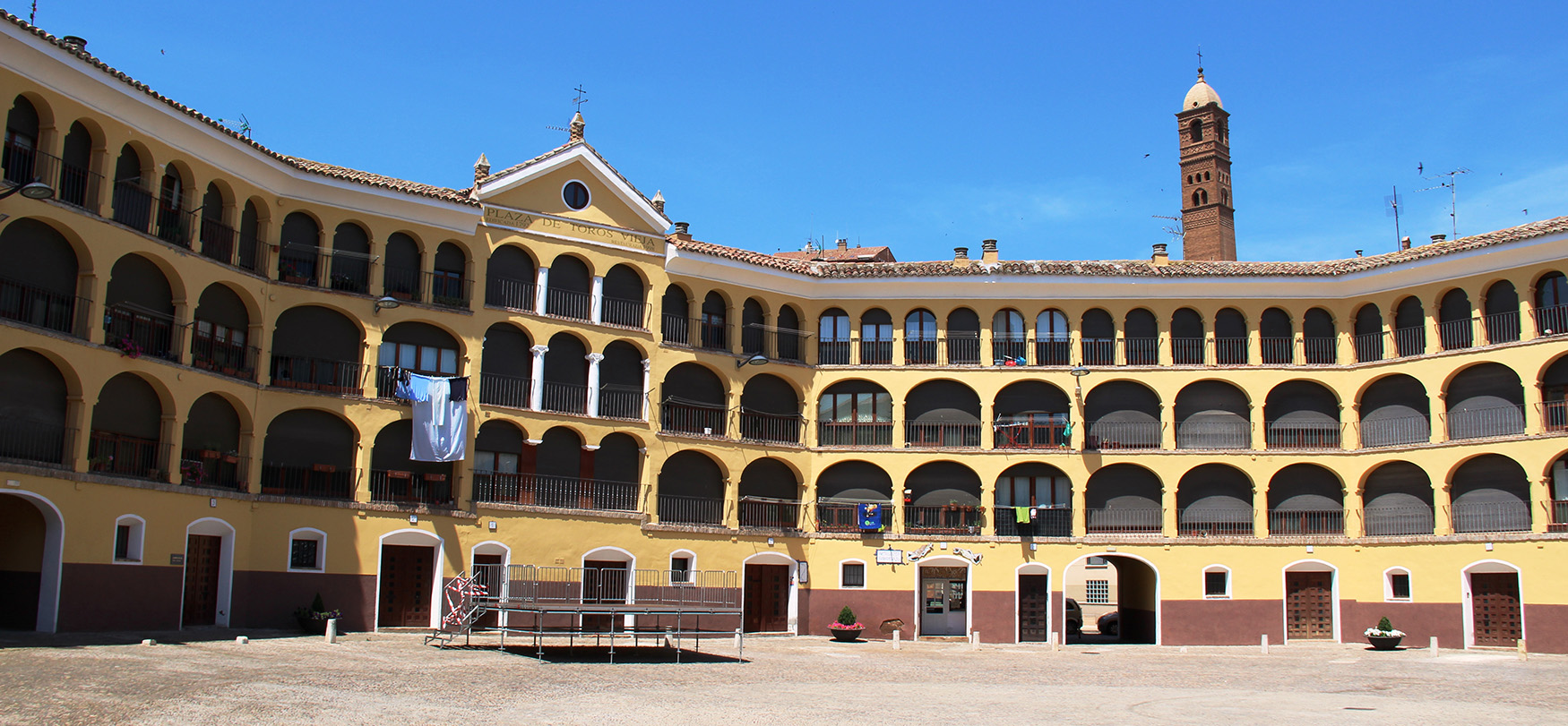 La plaza de toros de Tarazona, situada en el centro histórico de la ciudad. Al fondo la torre mudéjar de La Magdalena |